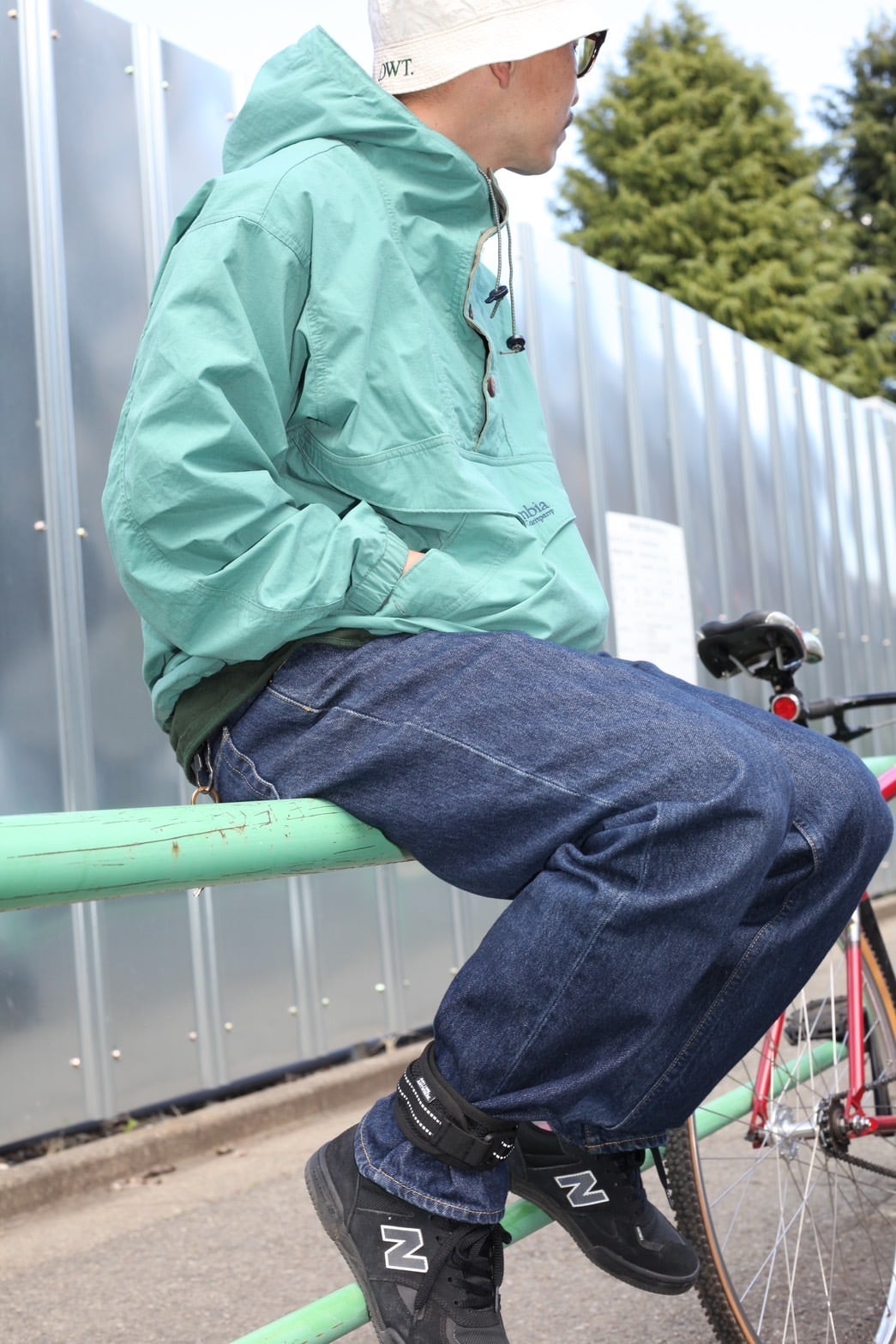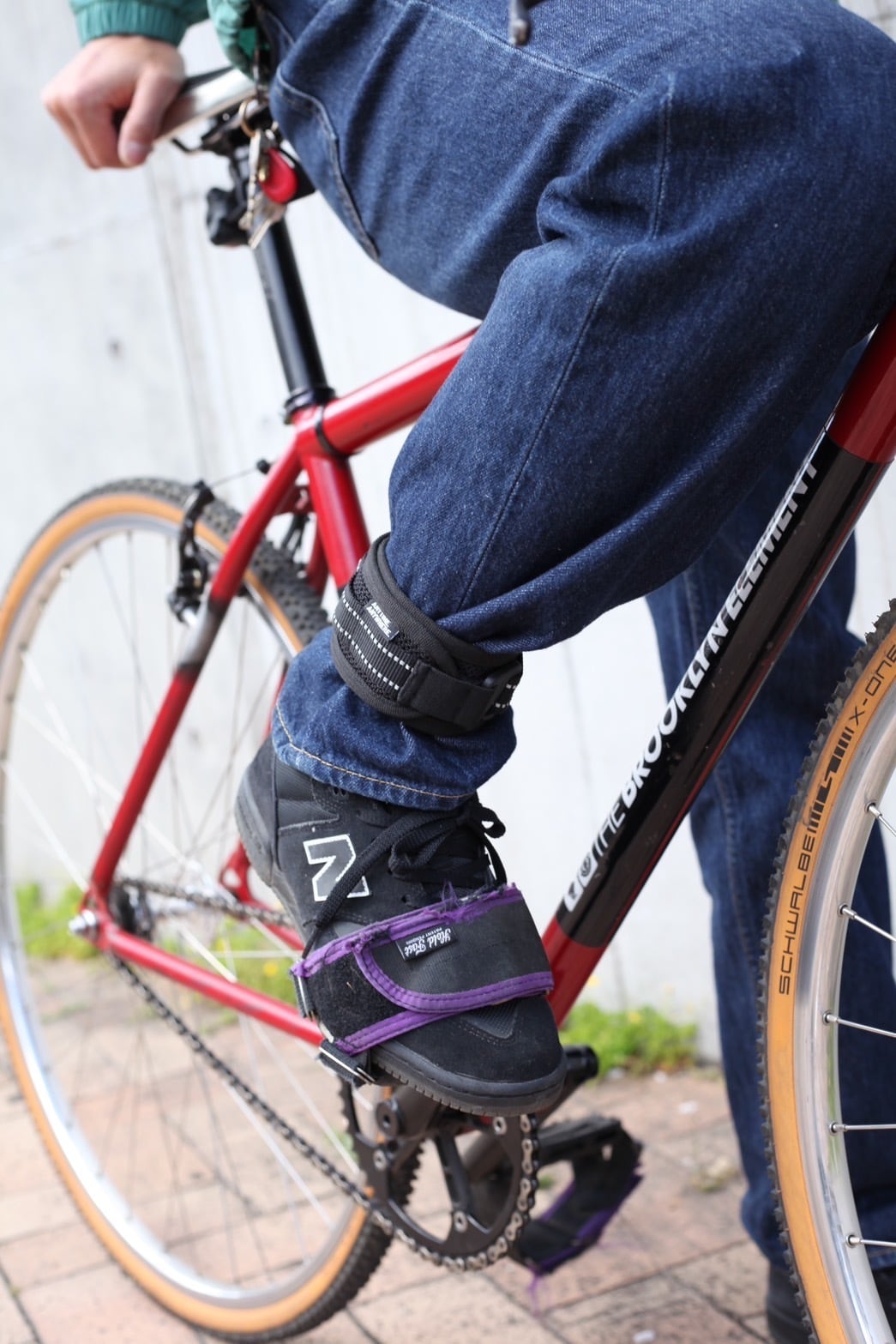 レングス短めのボトムやポリエステル多めのボトムでは滑ったり抜けたりする可能性があるのでフックとはベルトの端を5cmほど内側に折った状態でふくらはぎあたりに巻くとフィットしやすくなります。