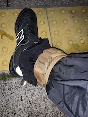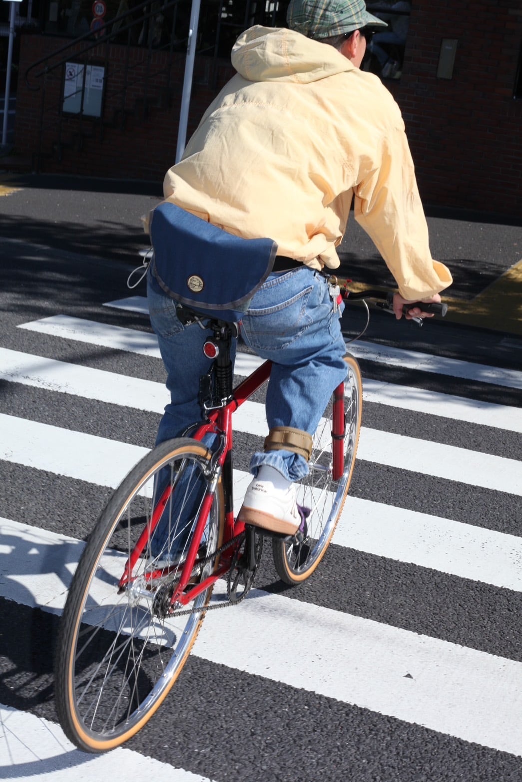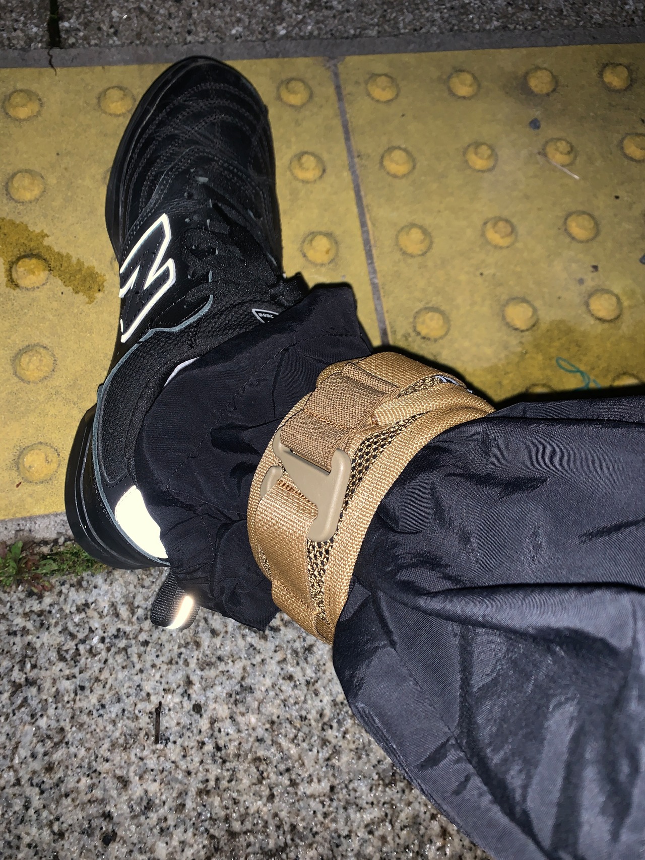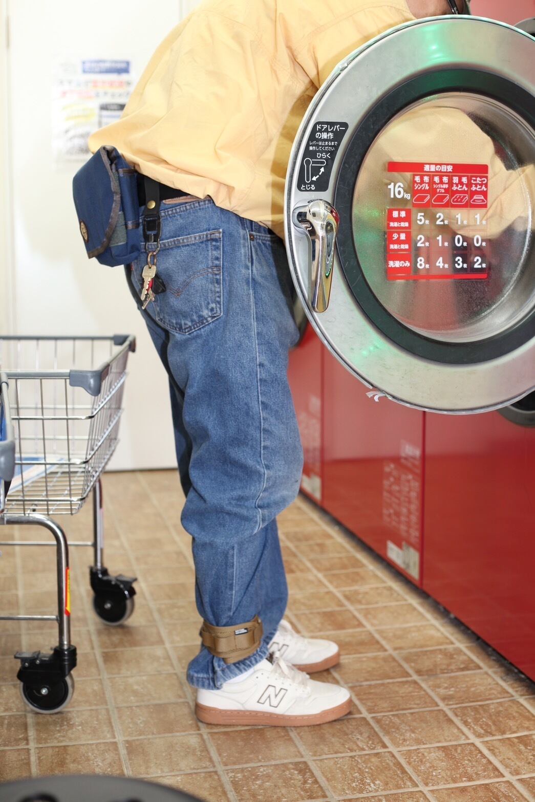 レングス短めのボトムやポリエステル多めのボトムでは滑ったり抜けたりする可能性があるのでフックとはベルトの端を5cmほど内側に折った状態でふくらはぎあたりに巻くとフィットしやすくなります。