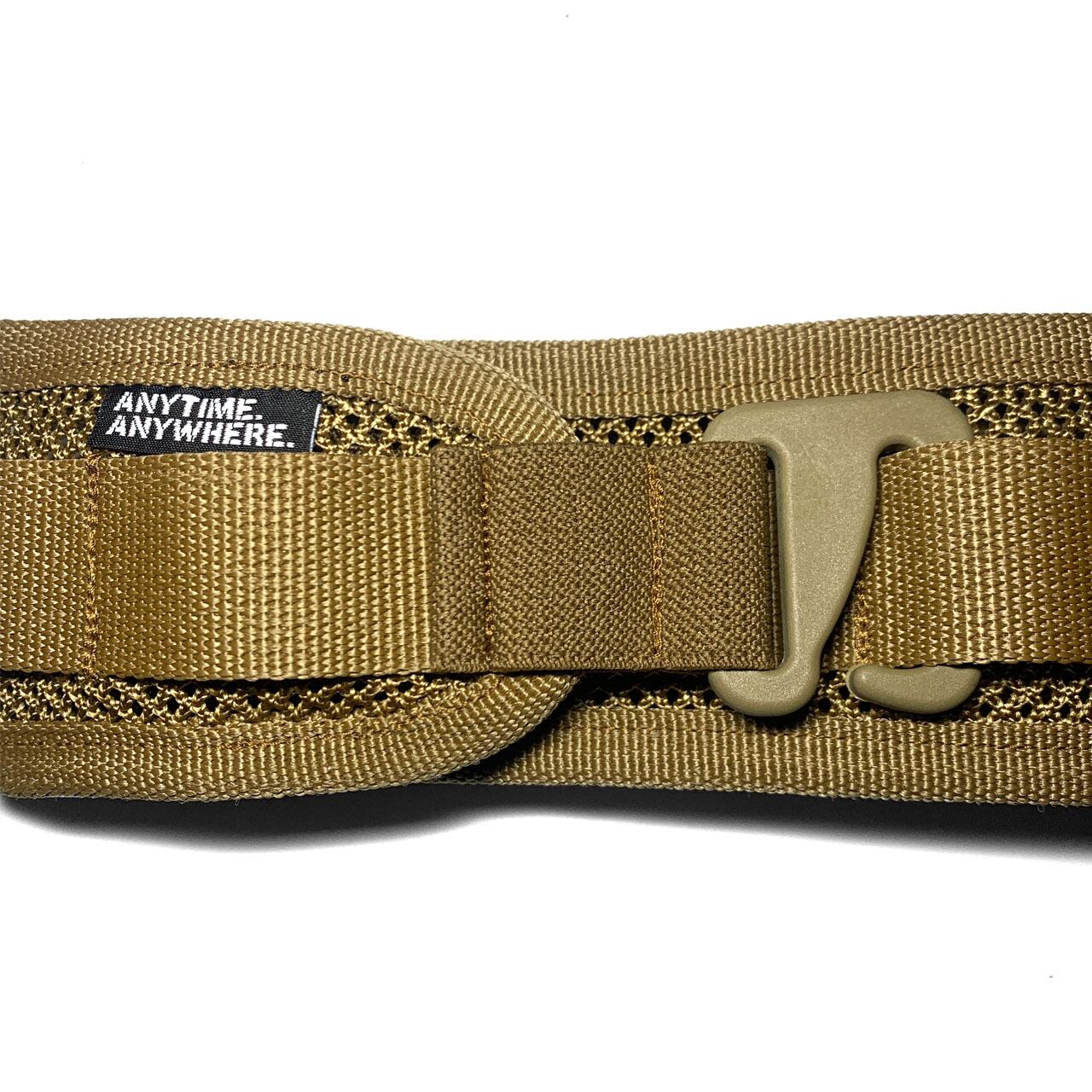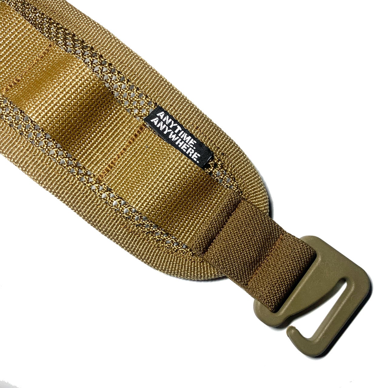 この”G-HOOK TROUSER STRAP”のベースとなる素材は軽量で高強度を誇るMIL-SPEC HEAVYWEIGHT MESHを採用。これに0.75inchのMIL-SPEC WEBBINGをパイピングとしてあしらい補強しております。そして1inchのMIL-SPEC WEBBINGでモールシステムを構築しました。またフックの脱着がしやすいようにモールは膨らませて縫製しております。またこのモールの膨らみによりベルトを巻いた際に適度なクッション性が生まれフィット感を高めてくれます。