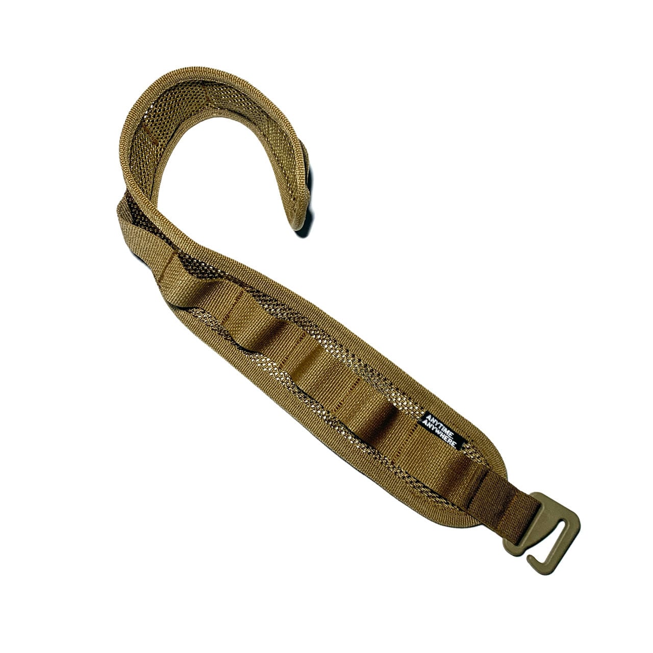 フックは軽量で高強度なイタリア2M社の樹脂製G HOOKを採用。このフックの付け根にはウーブンエラスティックウェビングを取り付けております。これにより若干の伸縮性があるのでフックを引っ掛ける際にさらにテンションをかけて締めることが可能です。