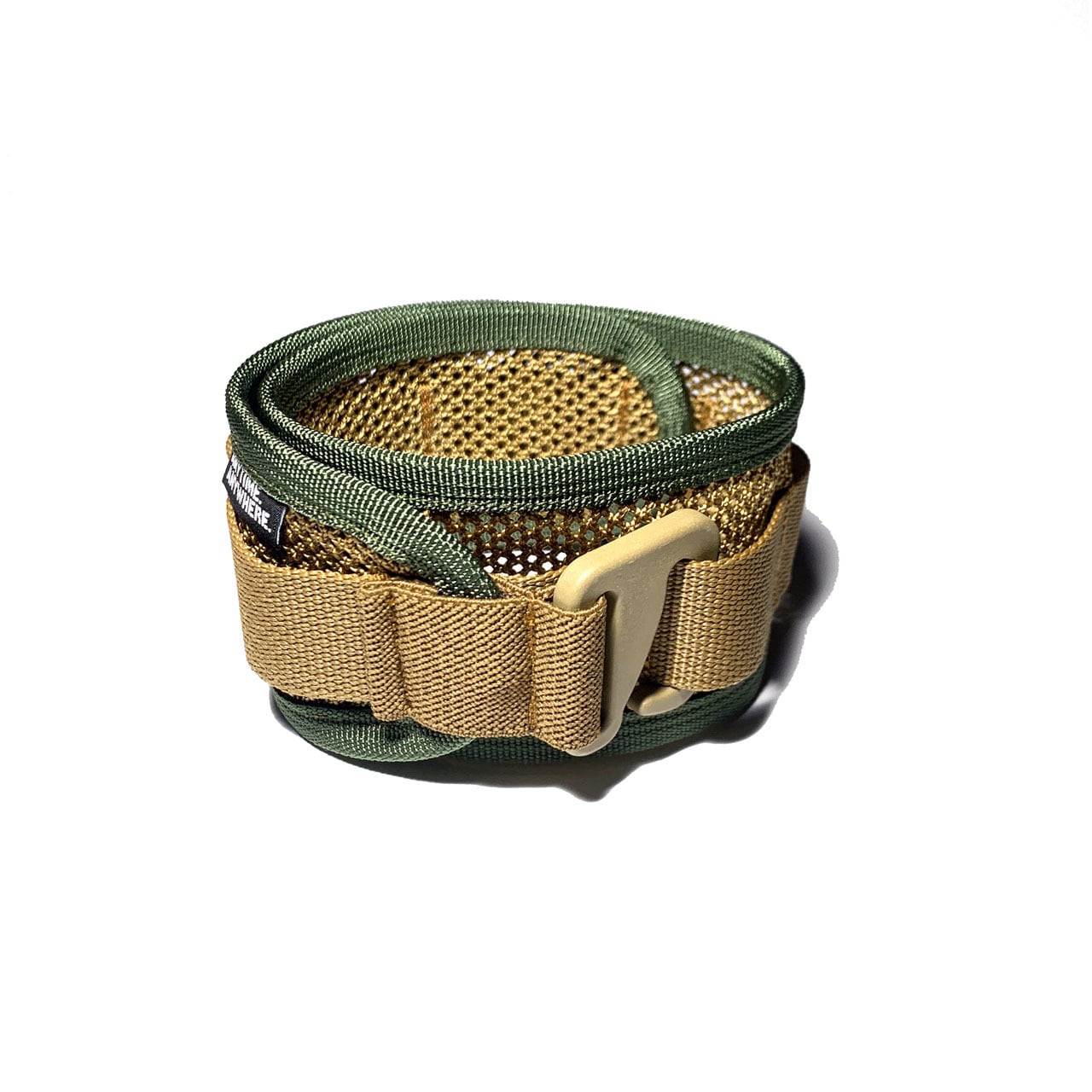 この”G-HOOK TROUSER STRAP”のベースとなる素材は軽量で高強度を誇るMIL-SPEC HEAVYWEIGHT MESHを採用。これに0.75inchのMIL-SPEC WEBBINGをパイピングとしてあしらい補強しております。そして1inchのMIL-SPEC WEBBINGでモールシステムを構築しました。またフックの脱着がしやすいようにモールは膨らませて縫製しております。またこのモールの膨らみによりベルトを巻いた際に適度なクッション性が生まれフィット感を高めてくれます。