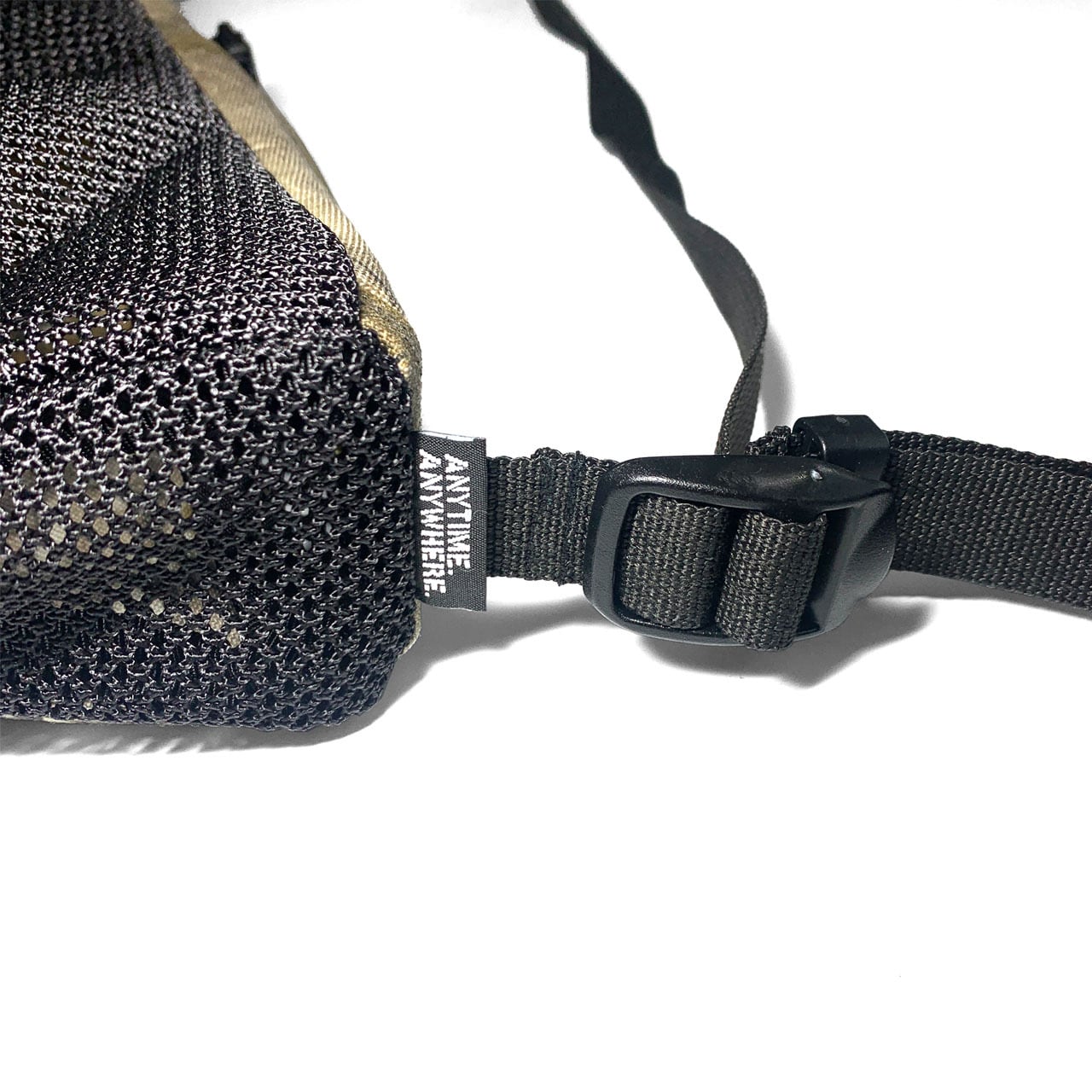 ベルトはバッグの大きさとバランスを考慮、また軽量化を意識して3/4inchのミルスペックウェビングを採用しました。ベルト端部にはフックが備わっているので余ったベルトは引っ掛けることができます。