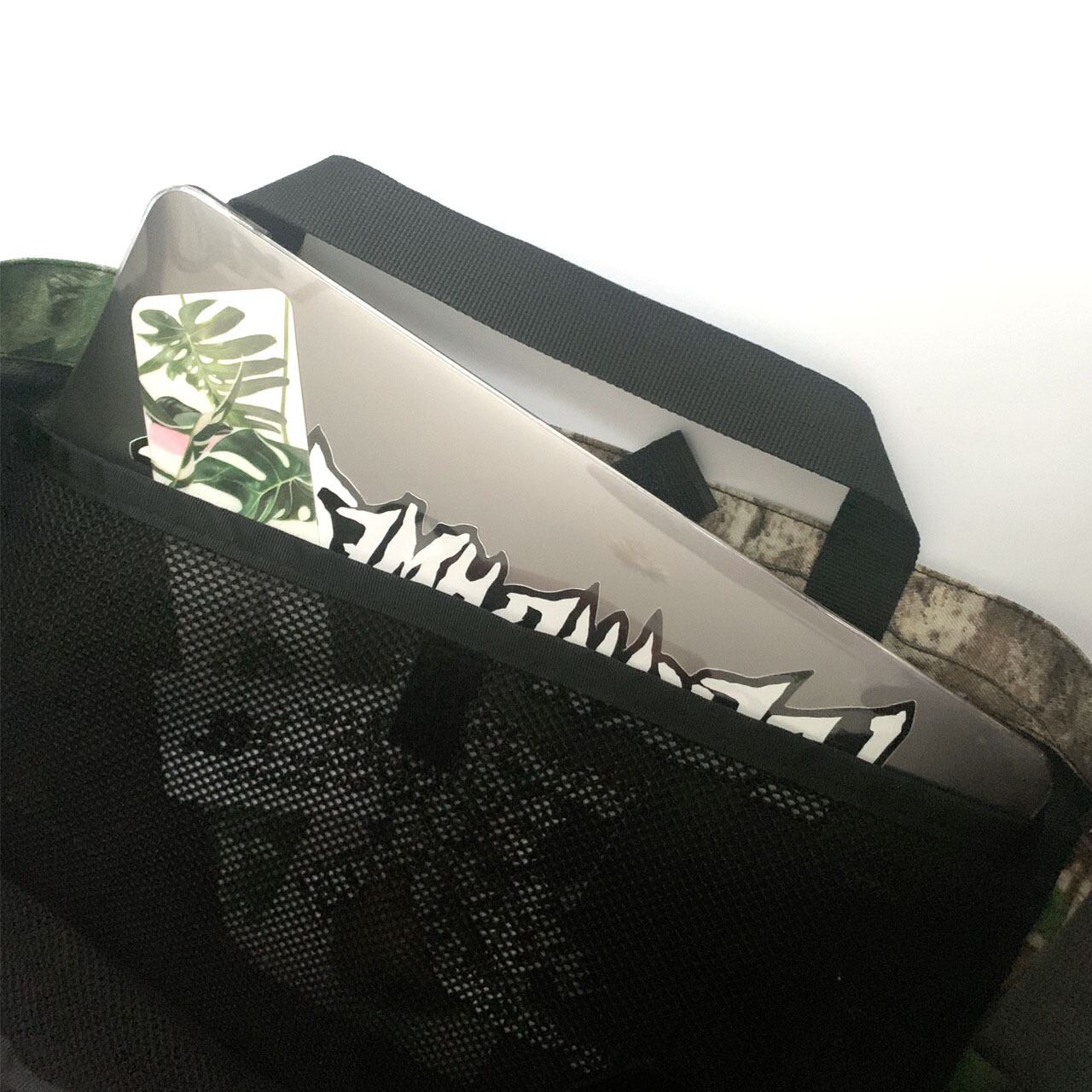 内側には両サイドにメッシュ素材の吊りポケットを完備。一方はA4サイズが入る大きさで13インチのラップトップを収納することが可能です。もう一方は財布やスマートフォンを収納出来るよう仕切られております。このメッシュはANYTIME ANYWHEREではお馴染みのMIL-SPEC HEAVY WEIGHT MESHを使用しました。