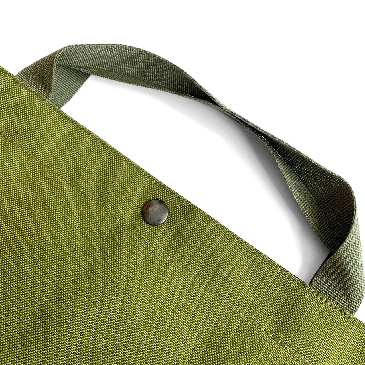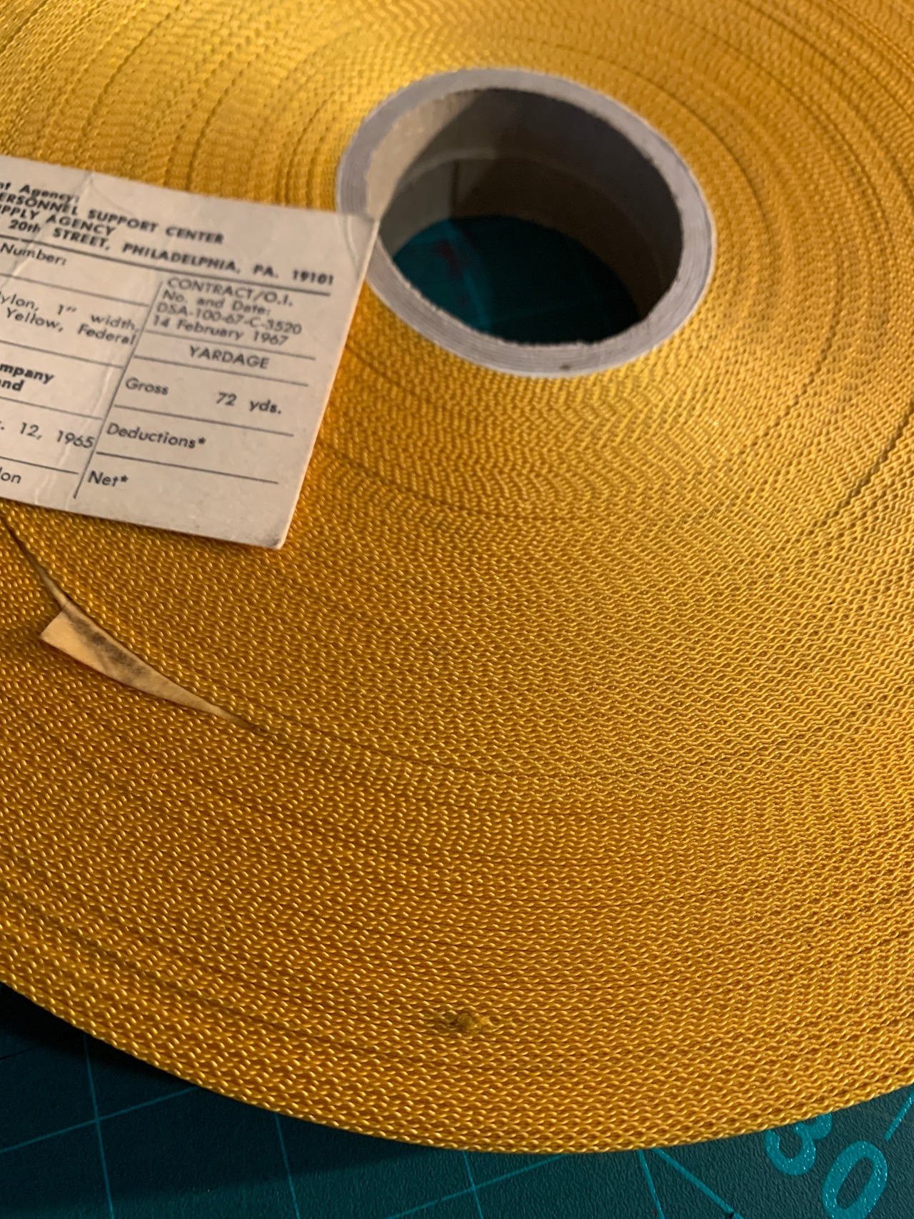 またバッグ本体のパイピングにはUS NAVYアビエーターのベストに装備されたラインカッターやストロボライトに付属するイエローリボンとして使われていた1967年製のナイロンウェビングのデッドストック品を使用しております。