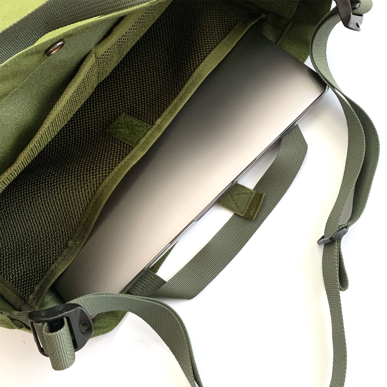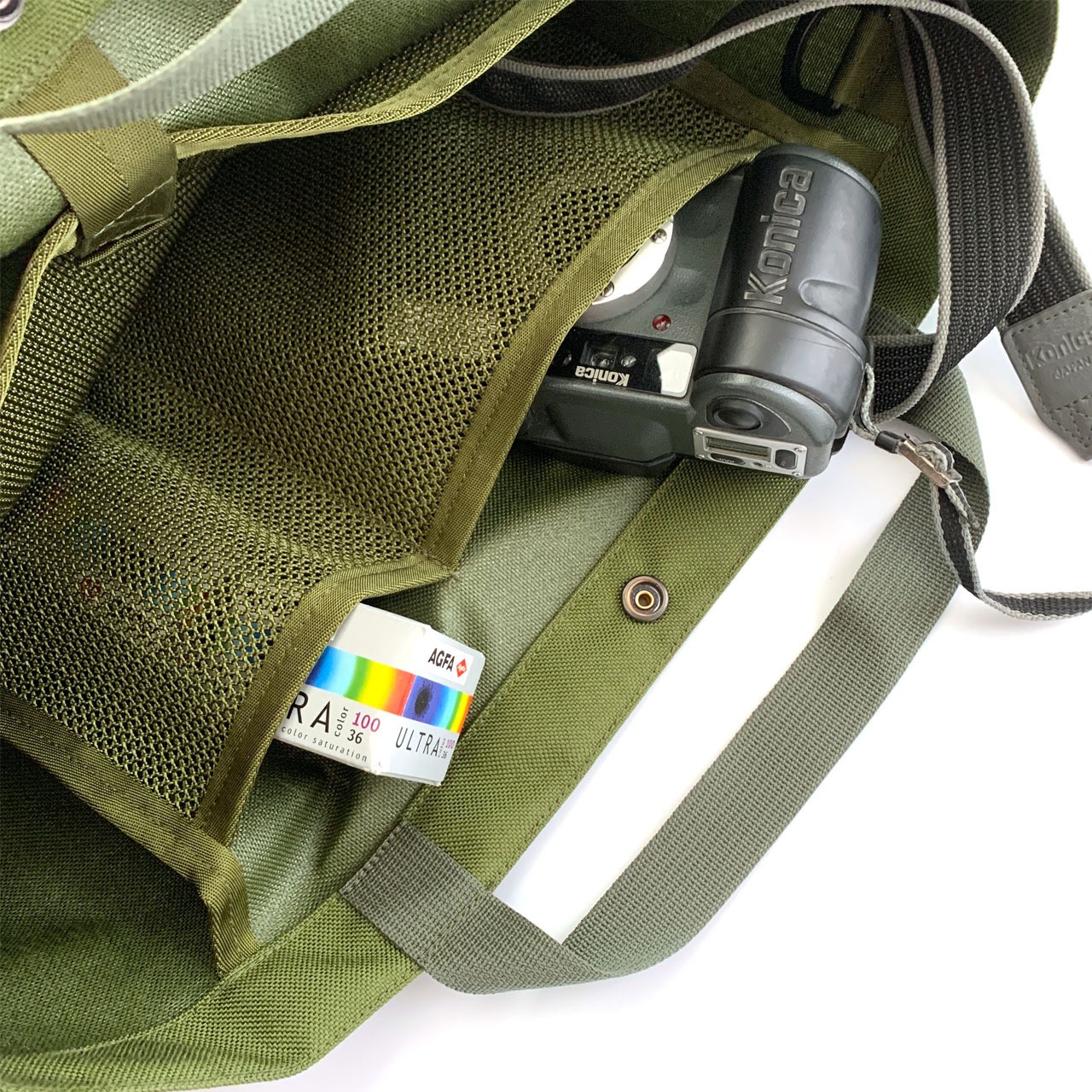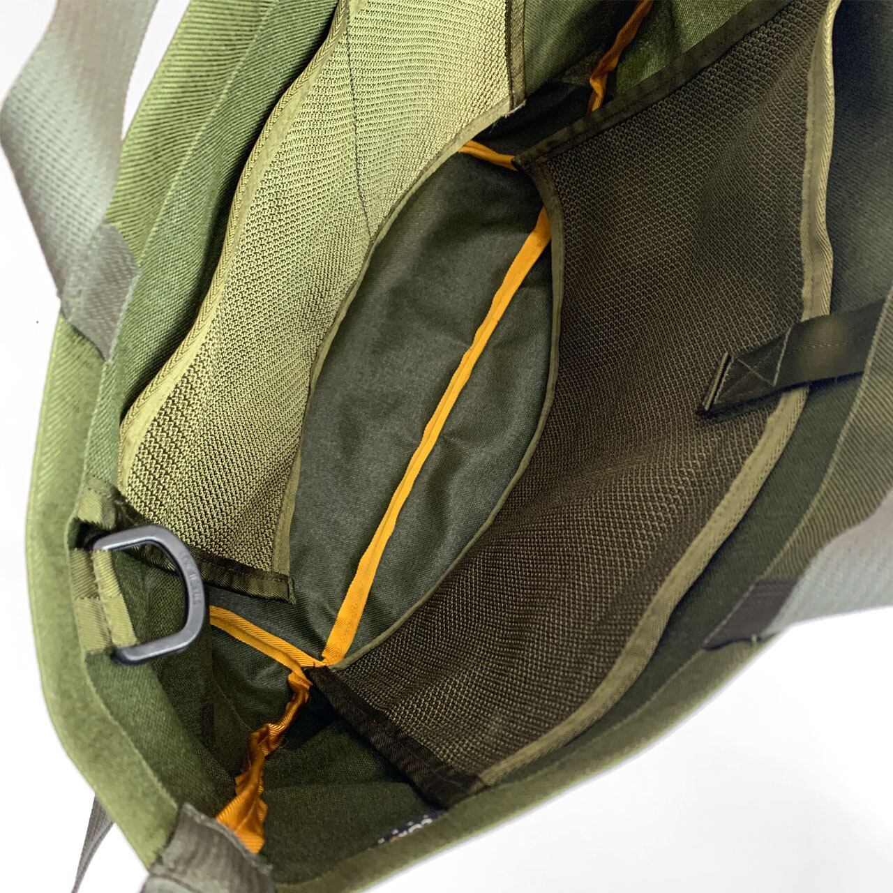 内側には両サイドにメッシュ素材の吊りポケットを完備。一方はA4サイズが入る大きさで13インチのラップトップを収納することが可能です。もう一方は財布やスマートフォンを収納出来るよう仕切られております。このメッシュはANYTIME ANYWHEREではお馴染みのMIL-SPEC HEAVY WEIGHT MESHを使用しました。
