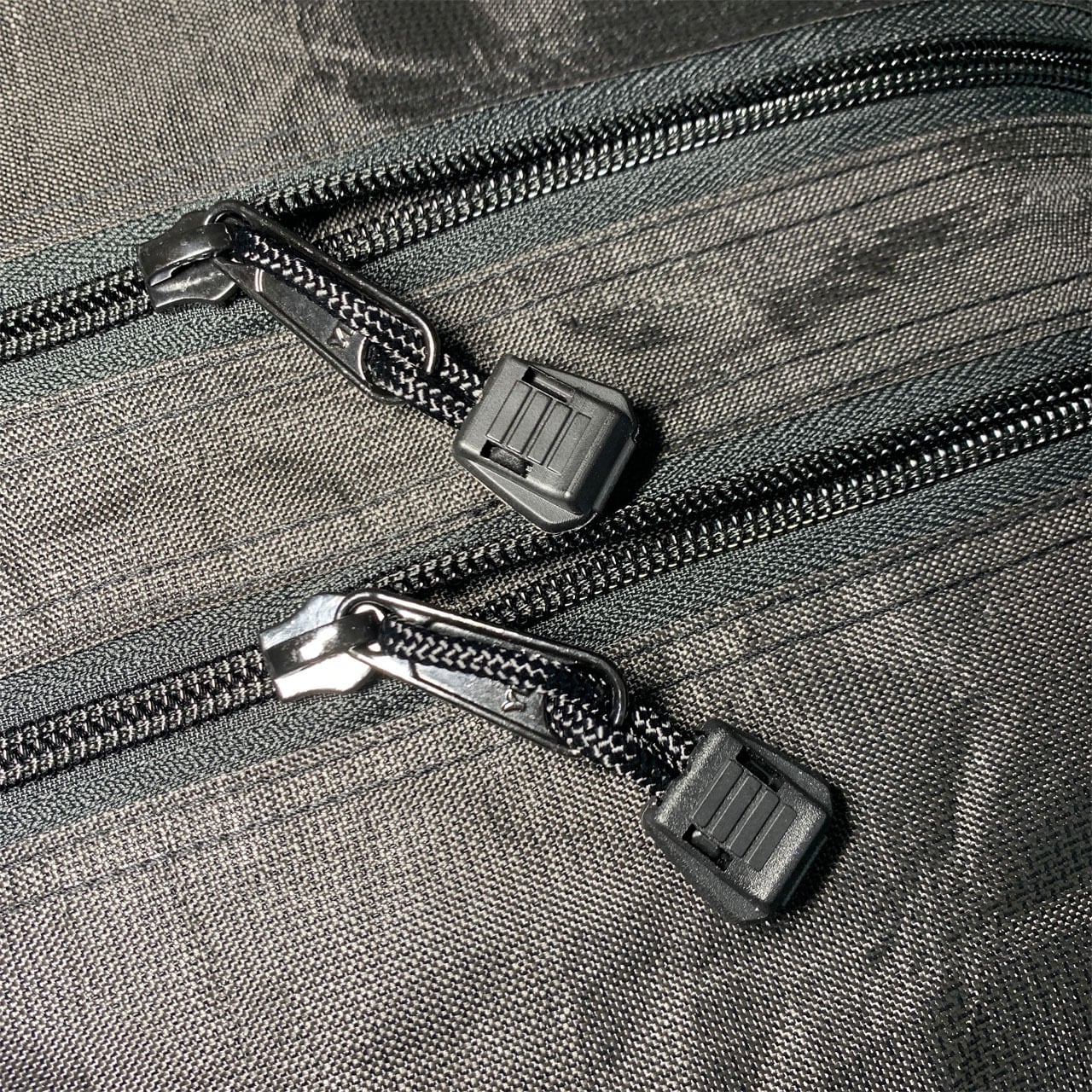 それぞれ3か所のジップにはYKK USA社製のコイルジップを採用。ジップの引き手にはITWのジップコードを取り付けました。